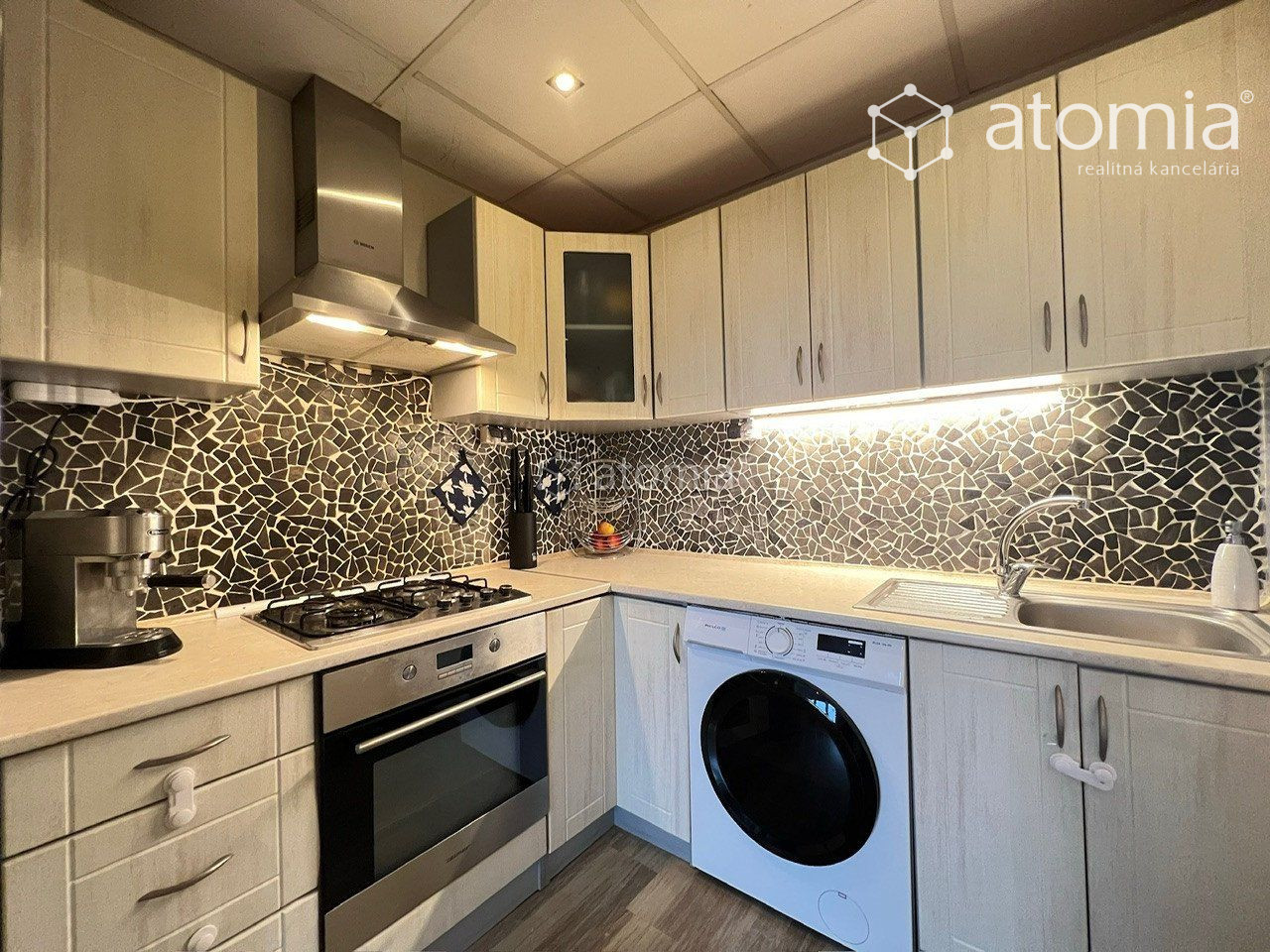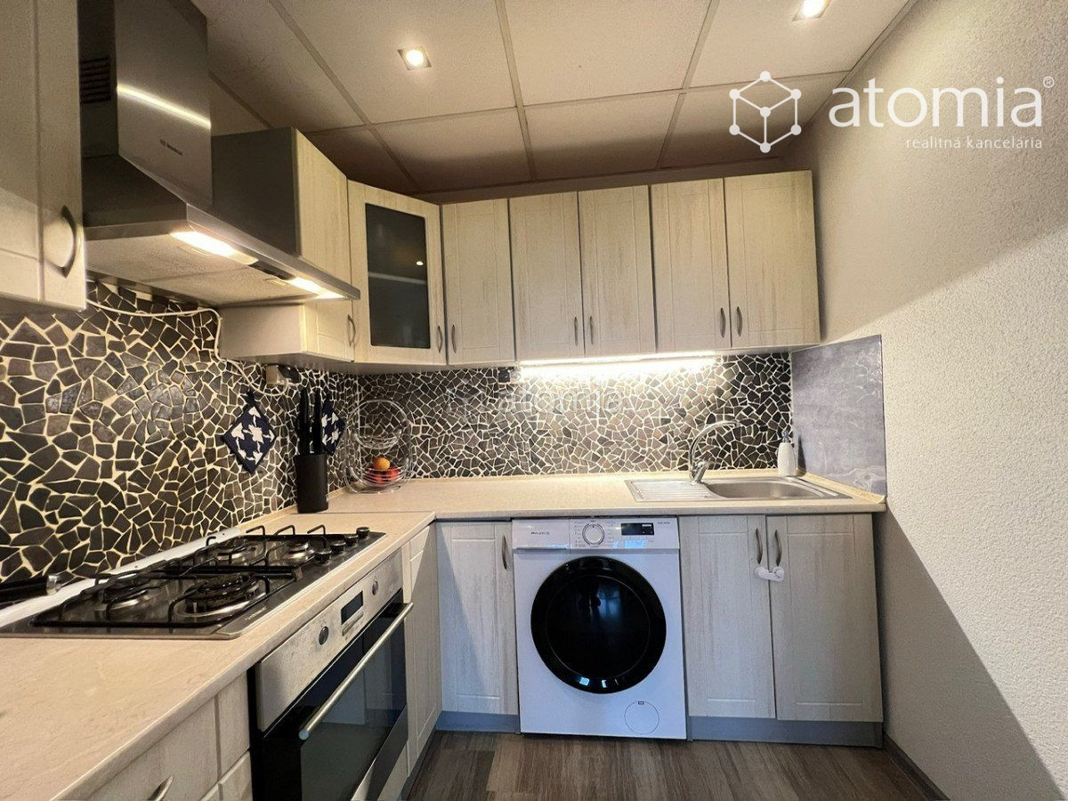 Obývacia izba je prepojená s kuchynským kútom. Kuchynská linka do tvaru L je vyrobená na mieru. V kuchynskej linke je vstavaná el. rúra a plynová varná doska zn. Zelmer, digestor zn. Bosch (uhlíkový filter) a osadený nerezový drez s pákovou batériou - SÚ SÚČASŤOU CENY NEHNUTEĽNOSTI. Pračka je zapojená a umiestnená v kuchynskej linke. Vo Vašej novej kuchyni sa nemusíte báť, že sa po namáhavom celom dni ešte nabeháte...stačí pár krokov a všetko máte po ruke na prípravu dobrého jedla.