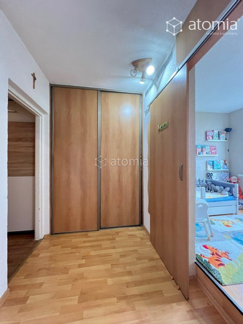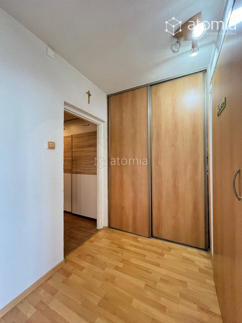 Zo spoločnej chodby obytného domu sa vchádza do predsiene bytu a z predsiene do kúpeľne, toalety a do chodby, z ktorej sú samostatné vstupy do izieb. Dostatok úložného priestoru zabezpečia dve veľké na mieru vyrobené vstavané skrine a vytvorený policový systém Vám umožní mať výborný prehľad o Vašich veciach - SÚ SÚČASŤOU CENY NEHNUTEĽNOSTÍ.