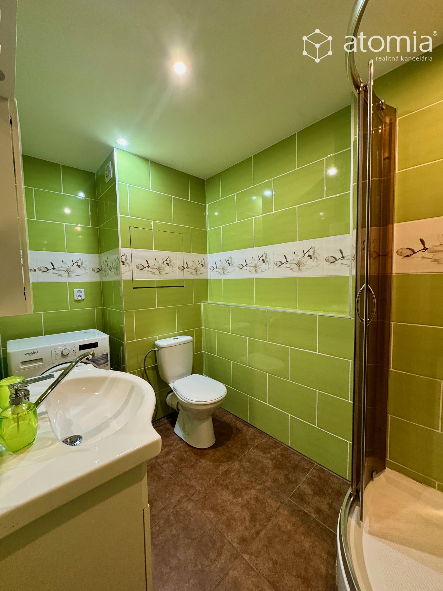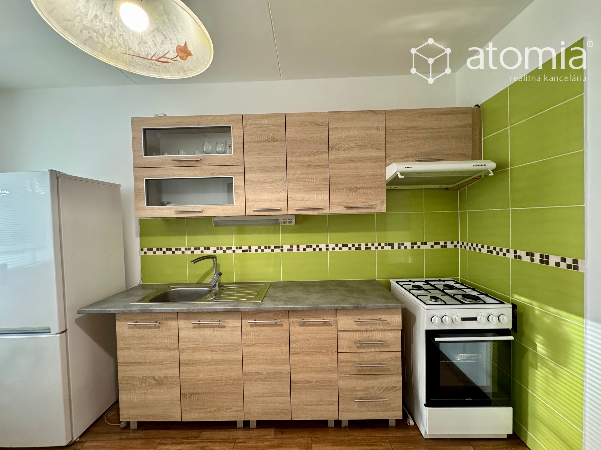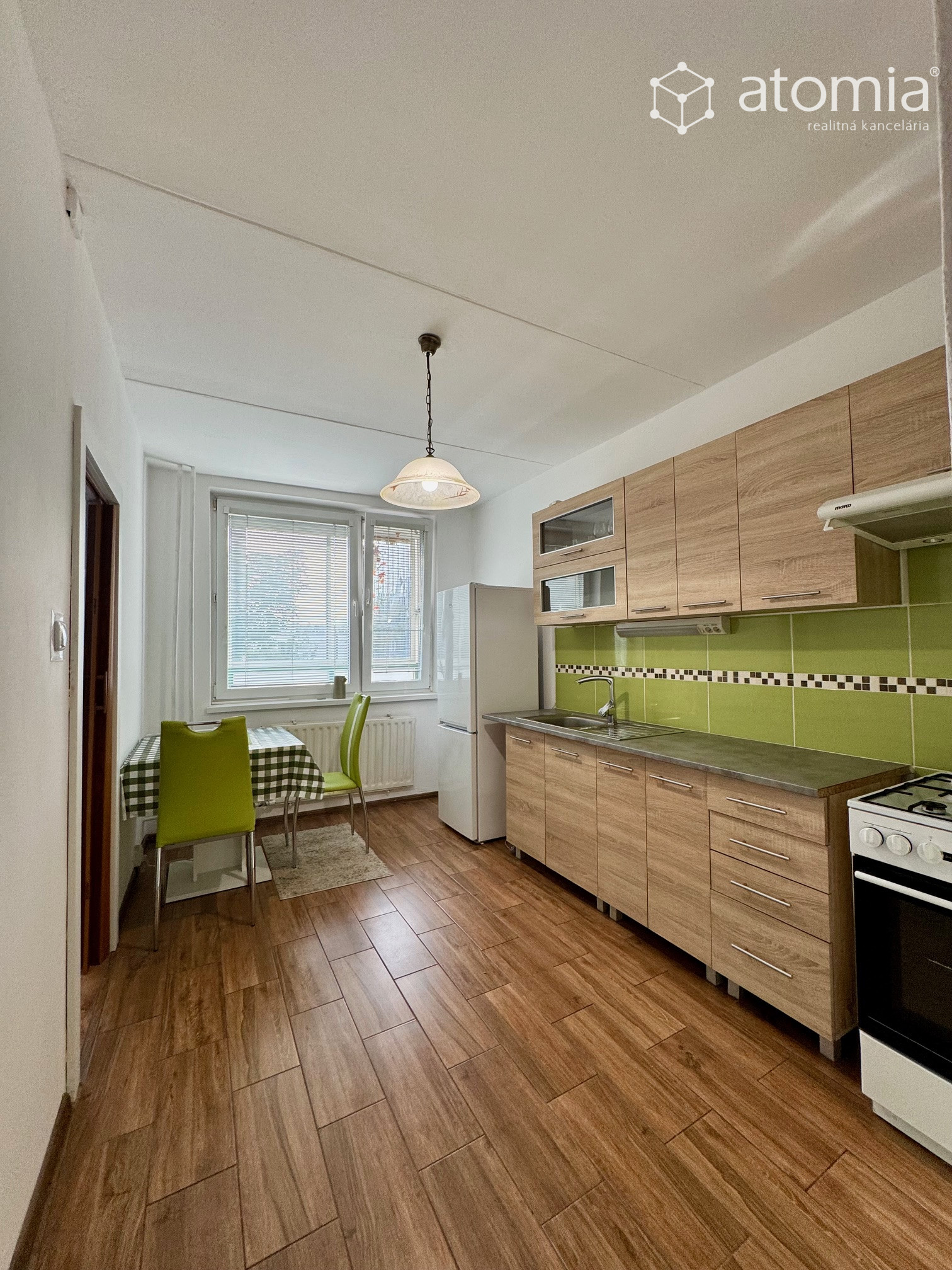 Byt je po kompletnej rekonštrukcii. Prenajíma sa zariadený - viď foto. Má plastové okná, murované jadro, kúpeľňu spojené s WC, plávajúcu podlahu v izbe, dlažbu v kuchyni, predsieni a jadre. Kuchyňa - kuchynská linka na báze dreva s osadeným nerezovým drezom s pákovou batériou, plynový sporák s elektrickou rúrou, digestor, chladnička s mrazničkou, jedálenský stôl so stoličkami. Izba - rozkladacia posteľ, úložný policový priestor, televízor, konferenčný stolík. V predsieni sa nachádza komoda, vstavaná skriňa. V kúpeľni sa nachádza sprchový kút, umývadlo osadené v skrinke so zrkadlom, toaleta, pračka. Uzatvorená loggia tenkostenným rámovým systémom.
