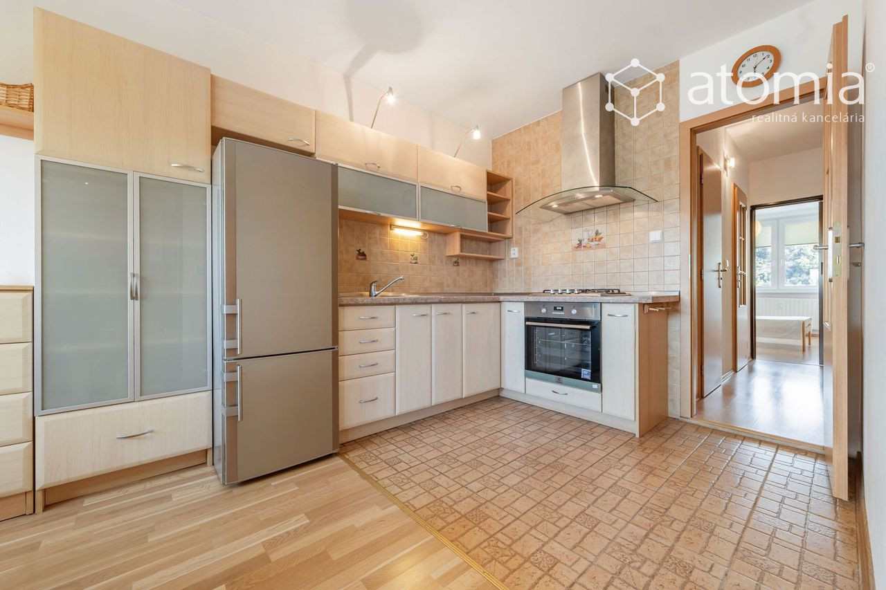 V kuchyni sa nemusíte báť, že sa po namáhavom celom dni ešte nabeháte...stačí pár krokov a všetko máte poruke na prípravu dobrej večere. Kuchynská linka vyrobená na mieru má dostatok úložného a pracovného priestoru. Má v sebe zabudovaný nerezový drez s pákovou batériou a značkové vstavané spotrebiče: digestor, plynovú varnú dosku, úplne novú elektrickú teplovzdušnú rúru. Súčasťou kuchynskej linky je chladnička s mrazničkou. V jedálenskej časti kuchyne je drevený stôl pre 6 osôb a stoličky. Vstup do kuchyne je z obývacej izby a z chodby.
