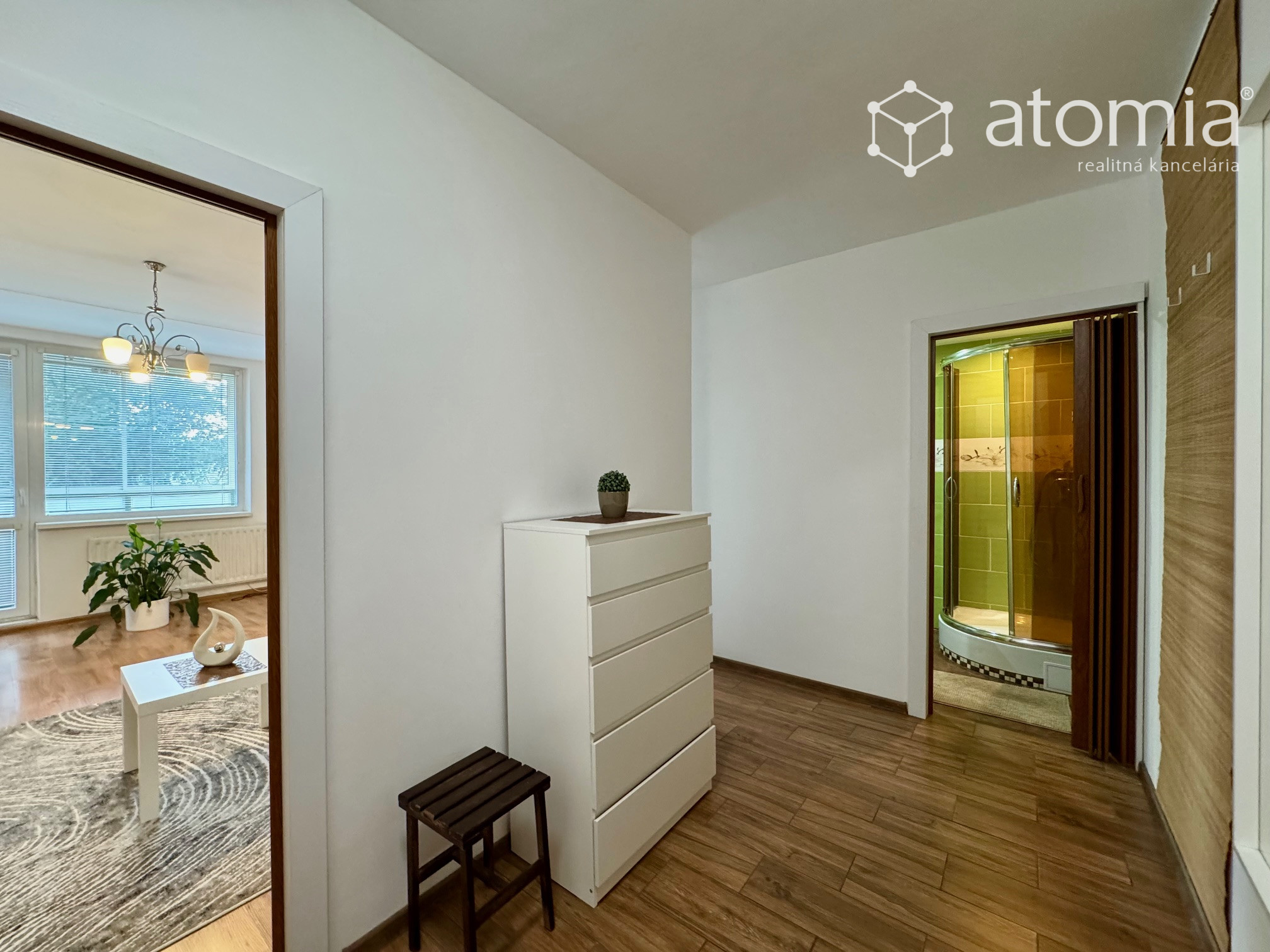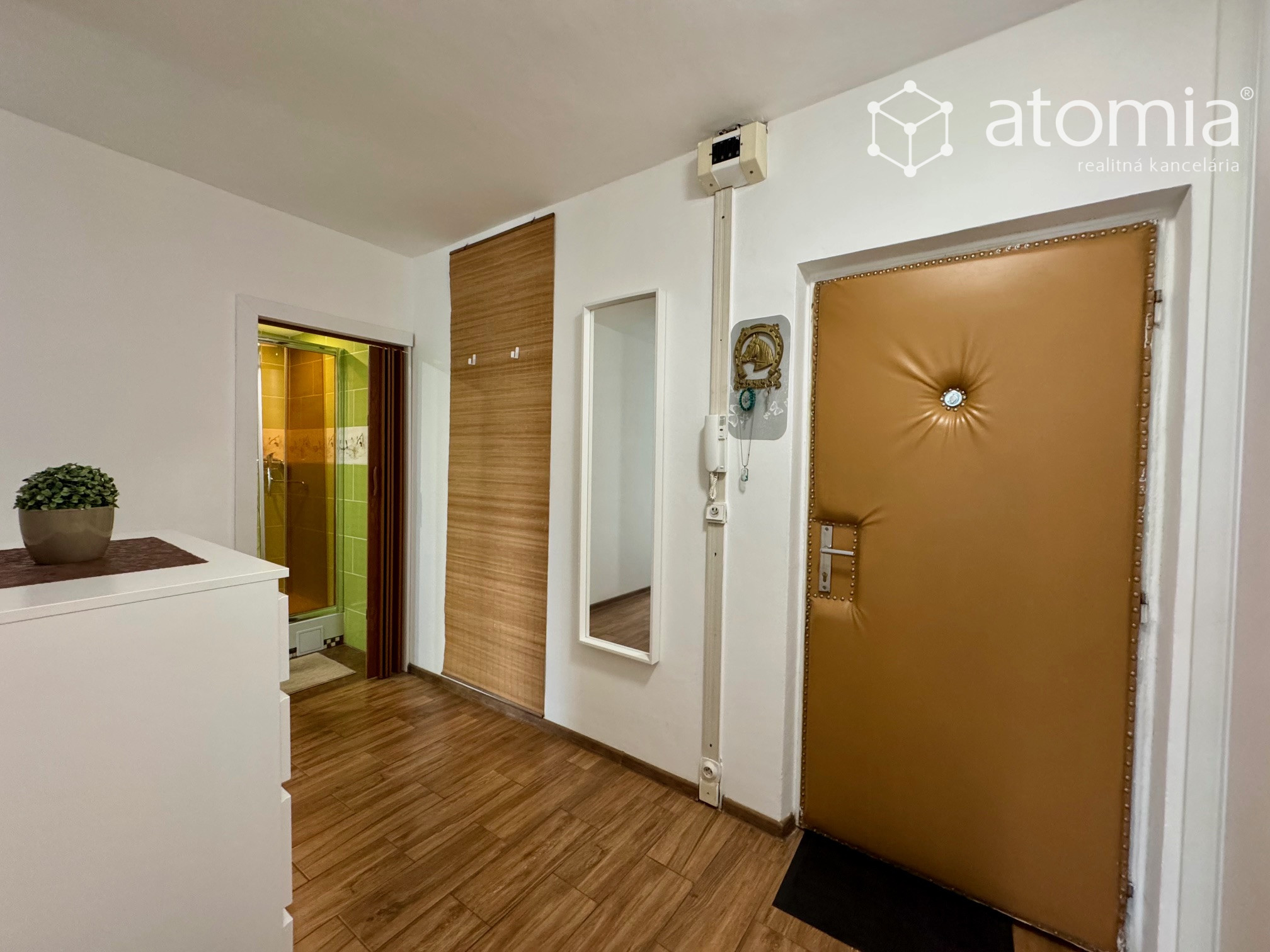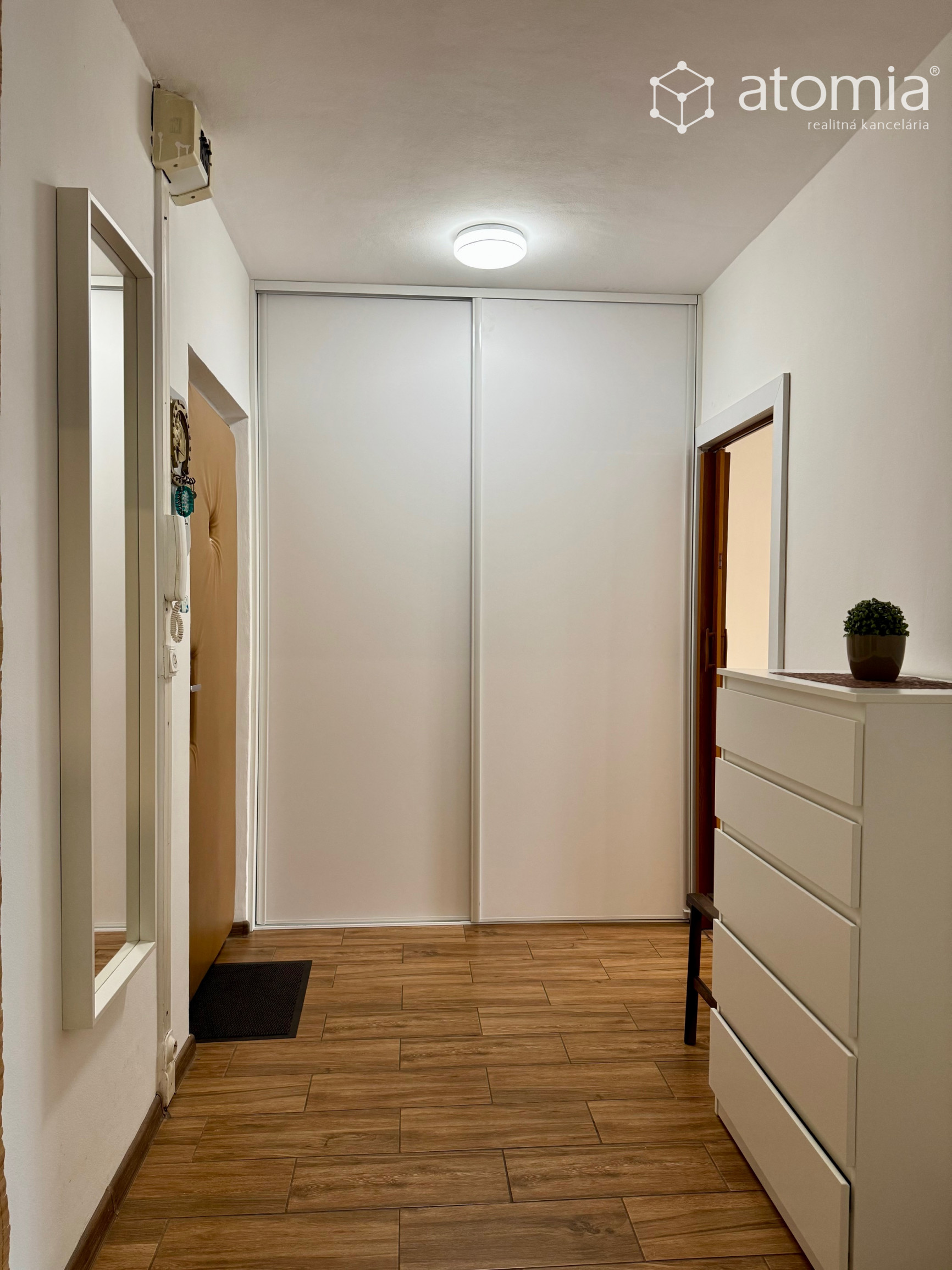 Byt je orientovaný na západ, má pekný výhľad na celé Košice, nepozeráte sa nikomu do okien. Byt je presvetlený a príjemný v lete a aj v zime. Vstup z predsiene je do obývacej izby so vstupom na loggiu, kuchyne a do kúpeľne s toaletou viď. foto. Zároveň je obývacia izba prepojená aj s kuchyňou.