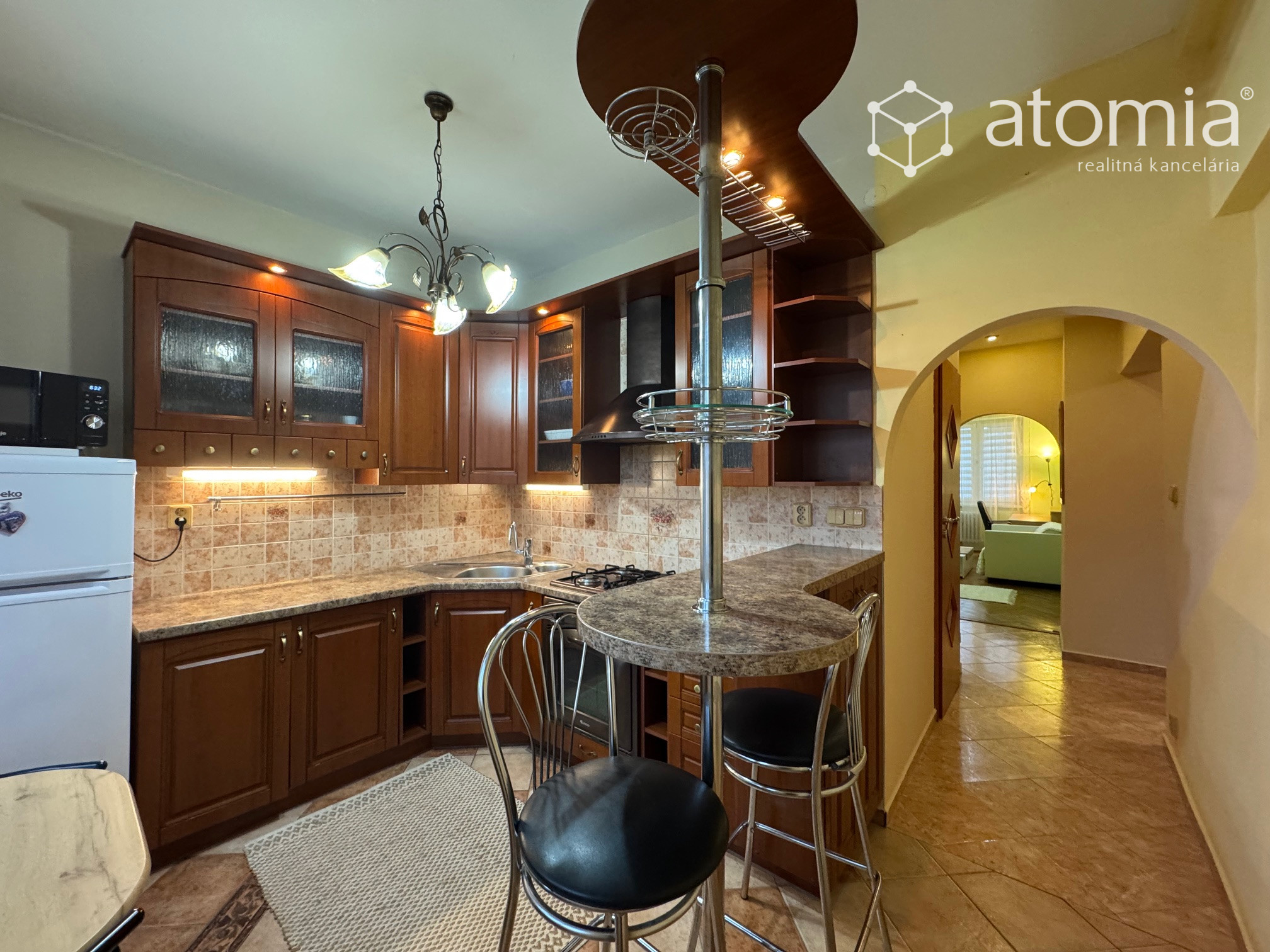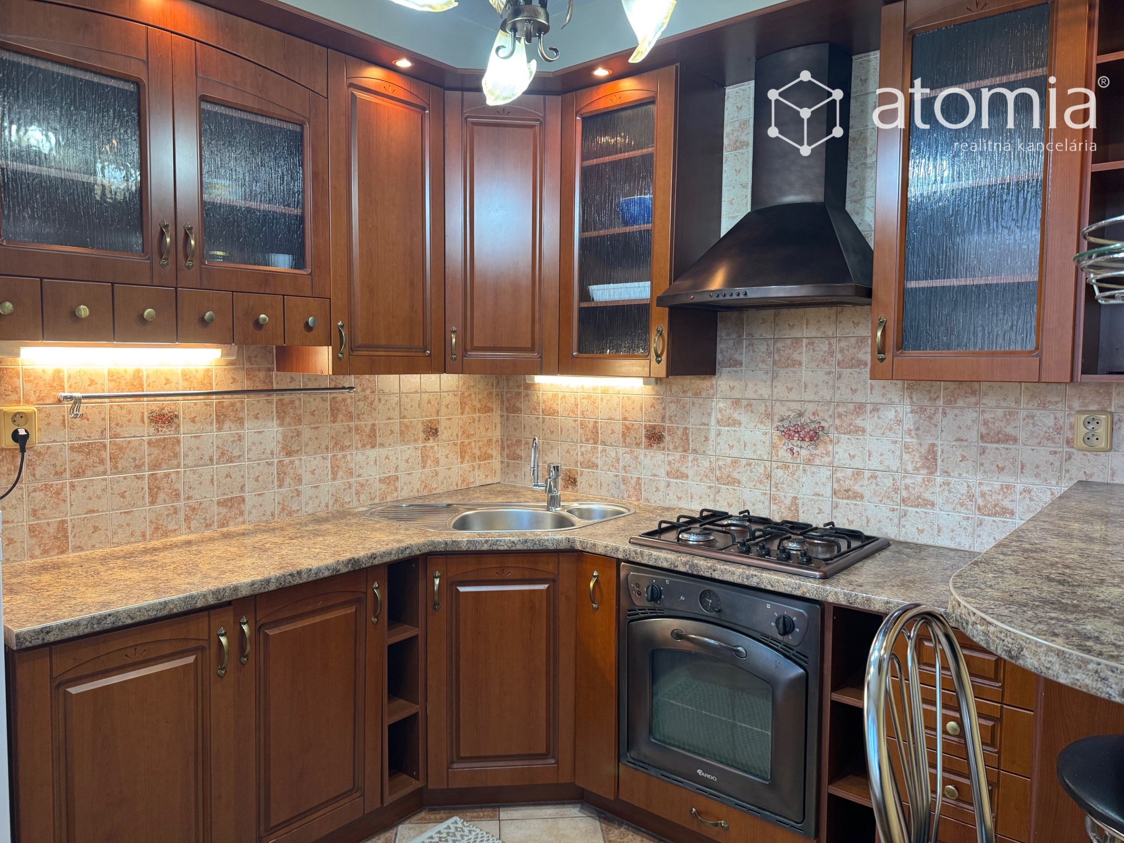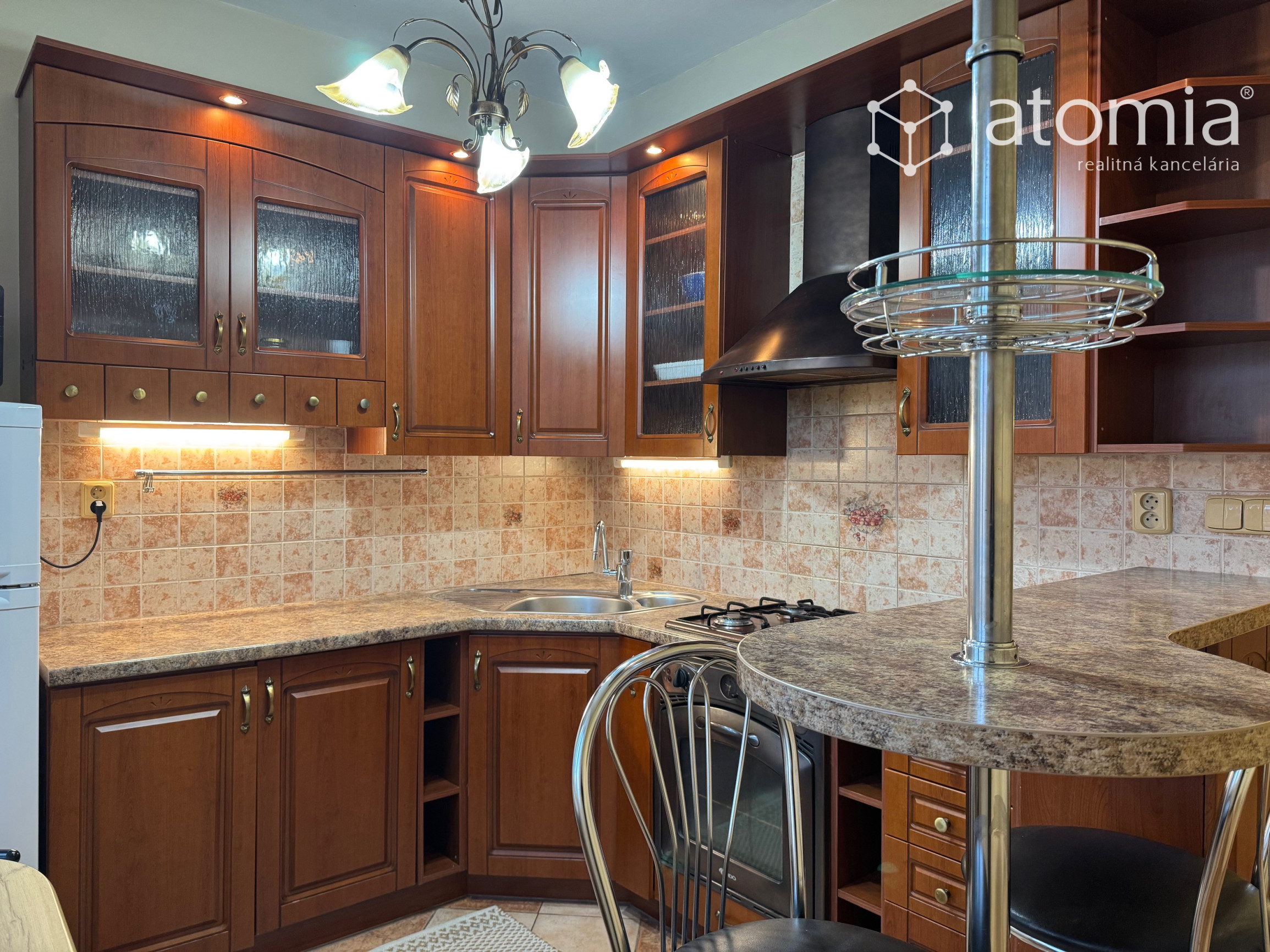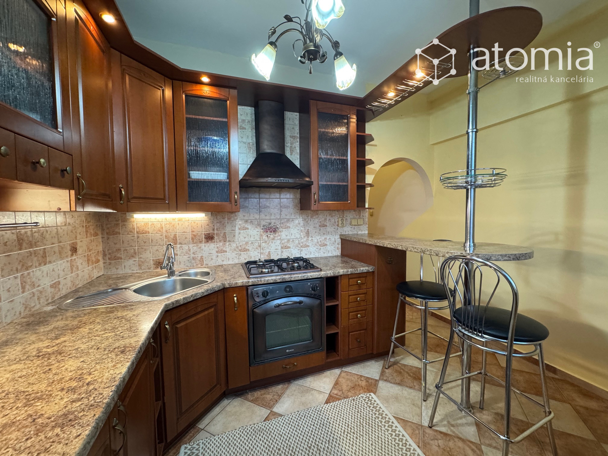 Byt je po kompletnej rekonštrukcii a veľmi dobre udržiavaný. V byte sú plastové okná so žalúziami, menené interiérové dvere. Murované jadro, nové rozvody vody, odpadu, elektriny. Podlahy - repasované bukové parkety v izbách, v kuchyni, kúpeľni s toaletou a chodbe je keramická dlažba a obklady. V kúpeľni je rohová vaňa, umývadlo, zrkadlo, pračka. Toaleta je súčasťou kúpeľne. V kuchyni je nová kuchynská linka do tvaru U so svetelnou rampou, barovým pultom a s dostatkom úložných priestorov. V kuchynskej linke na báze dreva je osadená vstavaná plynová varná doska, elektrická vstavaná rúra, nerezový drez s pákovou batériou. Byt sa prenajíma zariadený - viď. Foto.
