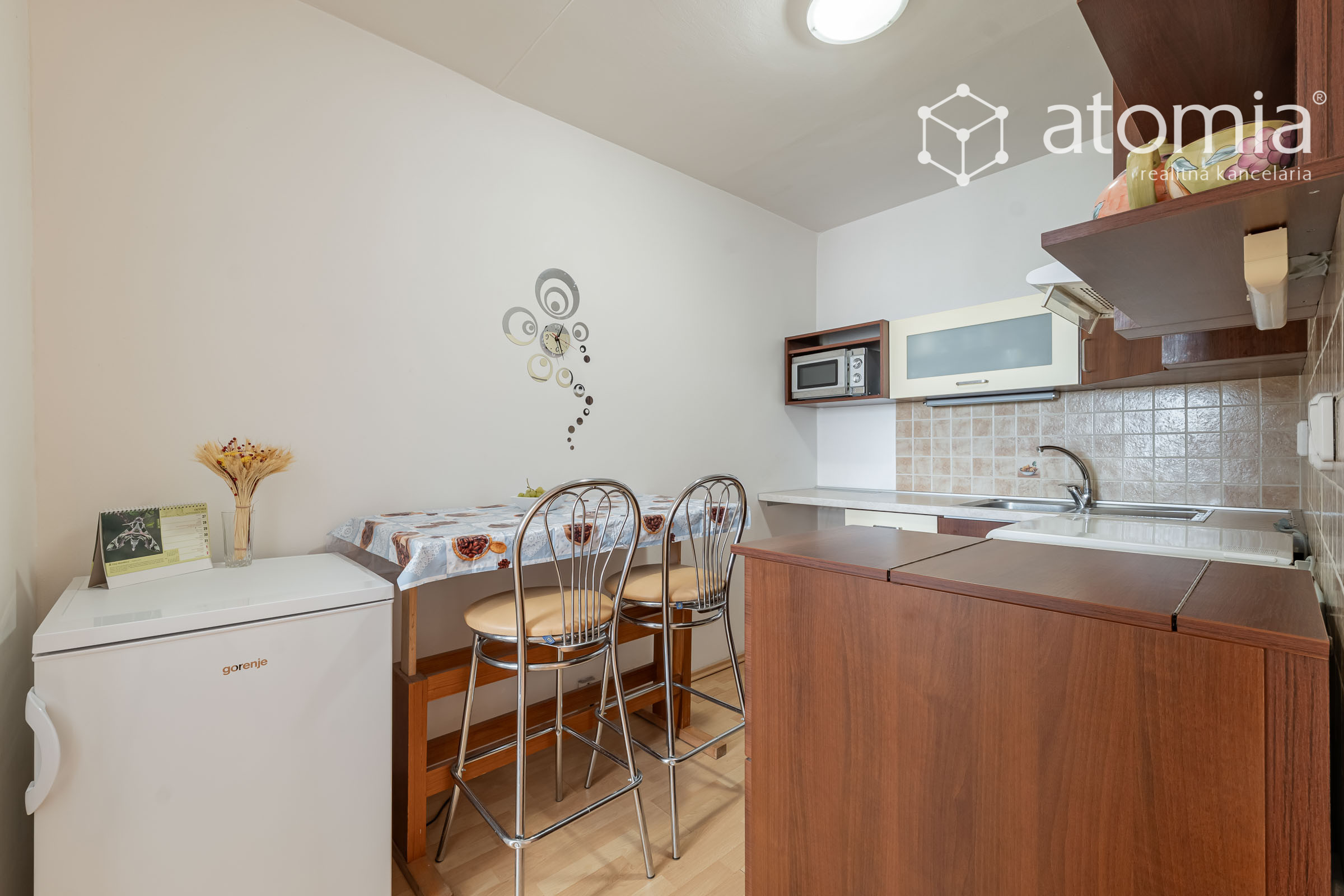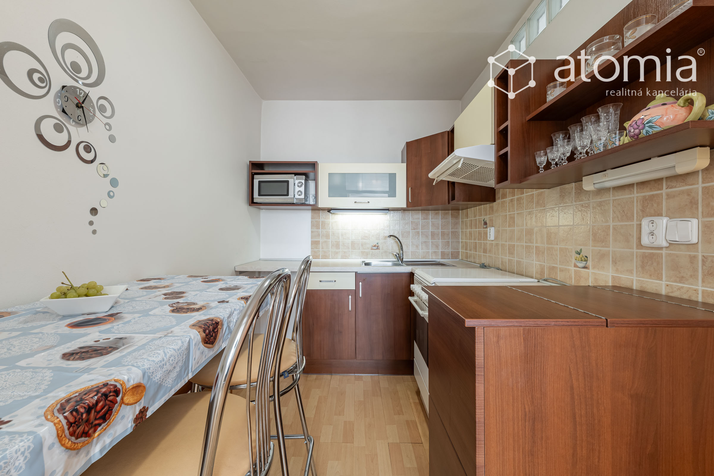 V kuchyni sa nemusíte báť, že sa po namáhavom celom dni ešte nabeháte...stačí pár krokov a všetko máte po ruke na prípravu dobrej večere. V kuchyni sa nachádza kuchynská linka na báze dreva s nerezovým drezom a pákovou batériou, plynový sporák s elektrickou rúrou a skrinka s umiestnenou pračkou. Kuchynská linka má dostatok úložného a pracovného priestoru. Na mieru je osadený stôl s barovými stoličkami.