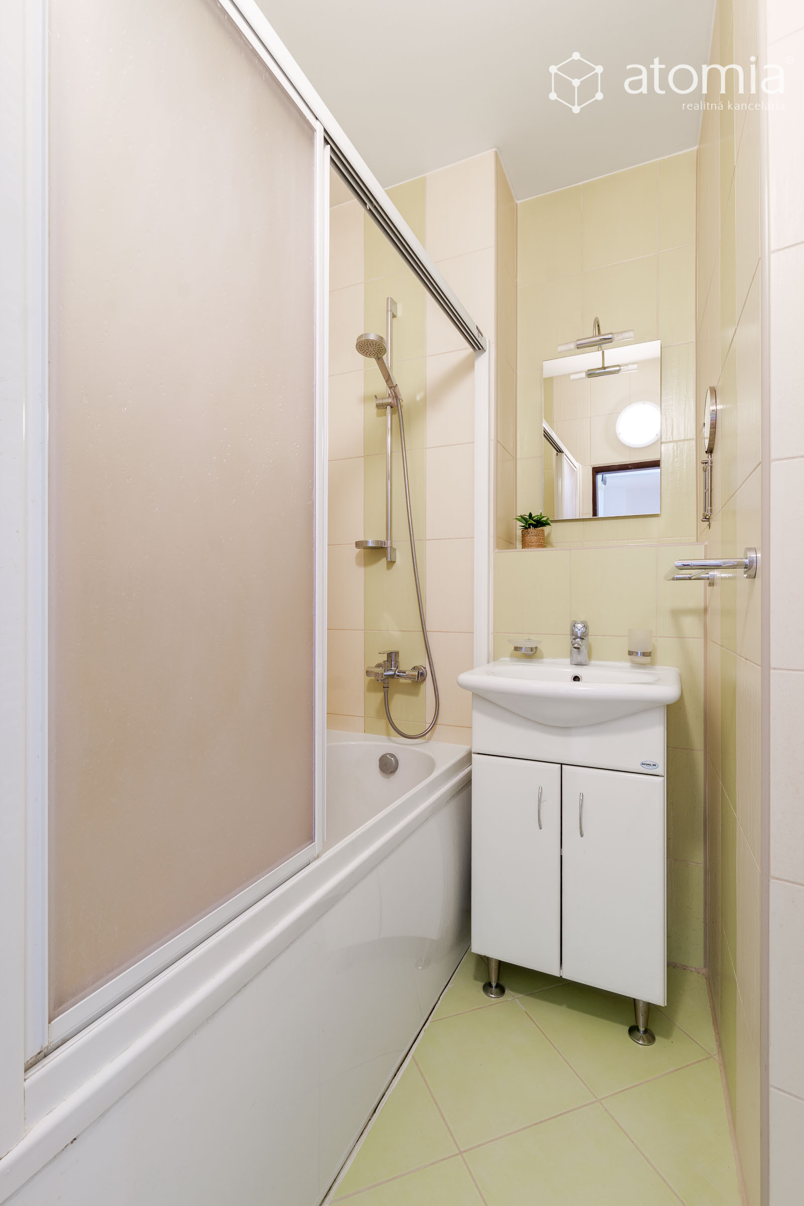 Kúpeľňa je murovaná, je po kompletnej rekonštrukcii. V kúpeľni je osadená vaňa so zástenou, ktorá umožňuje využitie vane aj na komfortné sprchovanie sa, páková batéria. V kúpeľni sa nachádza umývadlo osadené v skrine, zrkadlo, páková batéria, rebríkový radiátor. Na podlahe je dlažba a keramický obklad stien až po strop. Pračka je osadená v priestrannej predsieni (prívod vody a aj odpad). Toaleta je samostatná. Nová sanita v toalete, nové obklady a dlažba. Komoru v byte a v blízkosti kuchyne si budú pochvaľovať všetci bývajúci v tomto byte - zväčšuje úložný priestor, prípadne môže byť v budúcnosti aj miestnosťou na umiestnenie pračky a sušičky. Nová dlažba v komore a úložný regál na mieru.
