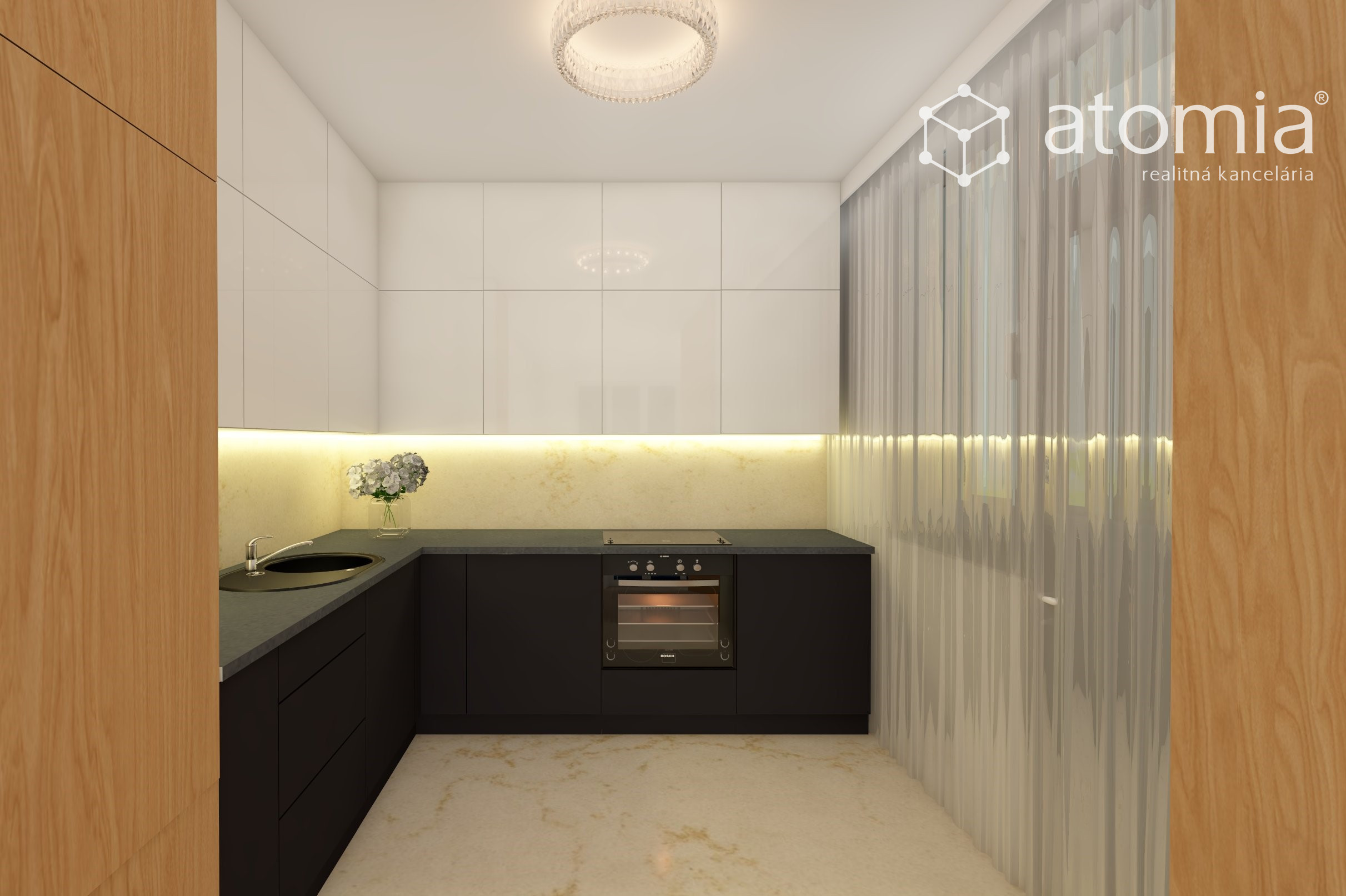 Vo Vašej kuchyni sa nemusíte báť, že sa po namáhavom celom dni ešte nabeháte...stačí pár krokov a všetko máte po ruke na prípravu dobrej večere. V kuchyni sa nachádza kuchynská linka zn. IKEA so vstavanými spotrebičmi - elektrická teplovzdušná rúra a digestor zn. Mora (vyvedený mimo bytu), indukčná varná doska zn. Electrolux, umývačka riadu zn. Ikea - Electrolux. Kuchynská linka má dostatok úložného a pracovného priestoru. Z kuchyne je vstup do špajzky s oknom, ktoré zabezpečuje vetranie špajzky. V špajzke sa nachádza úložný policový systém a chladnička s mrazničkou zn. LG.