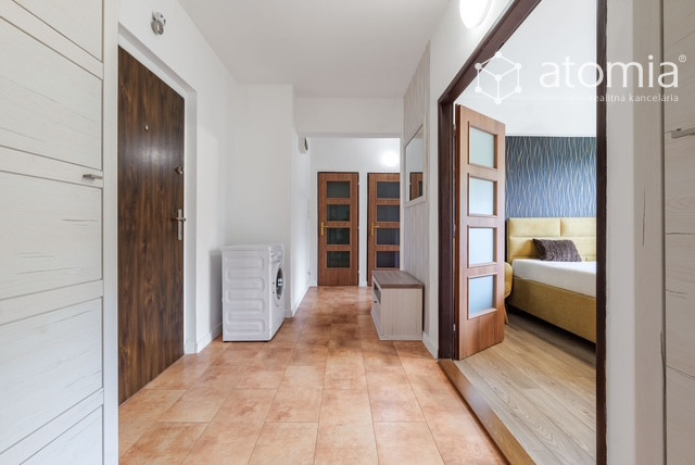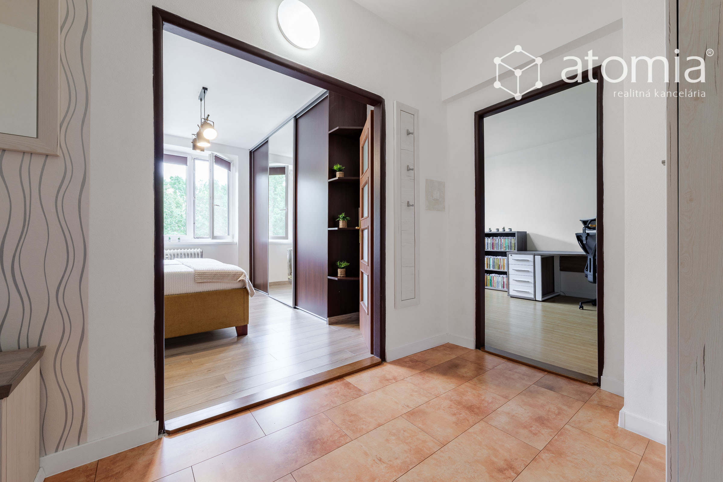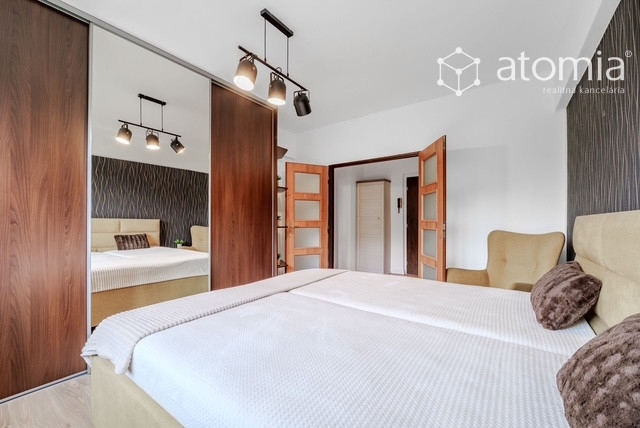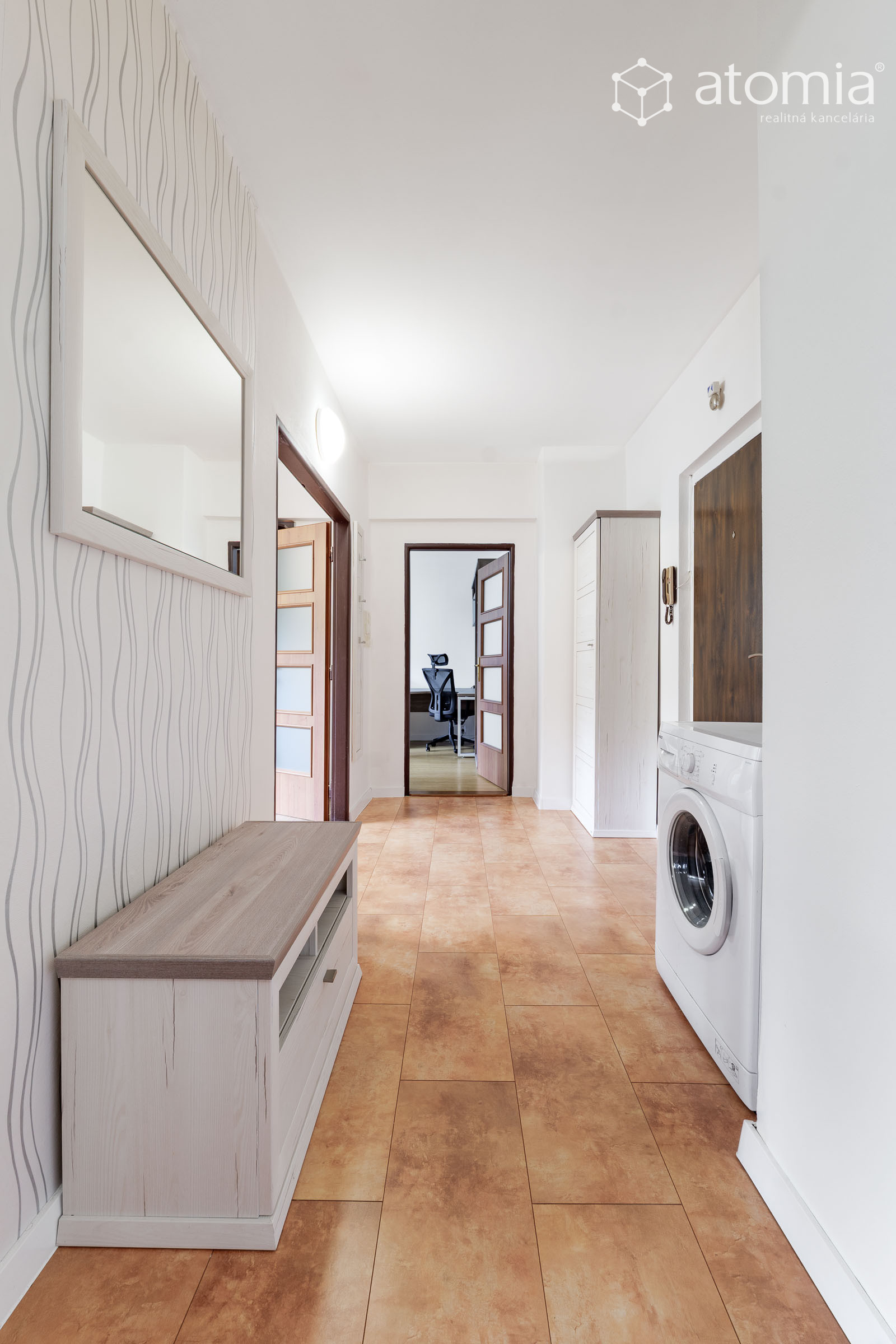 Uvedené priestory sú priestranné, do každej miestnosti v byte je samostatný vstup z predsiene a chodby. V obývacej izbe je priestor aj na pracovňu. Zariadenie chodby - nábytok a pračka zn. Beko je súčasťou ceny nehnuteľnosti. Táto dispozicia bytu umožní každému členovi rodiny nájsť si ten svoj priestor na prácu a oddych a zároveň je ideálna pri kúpe bytu na prenájom.