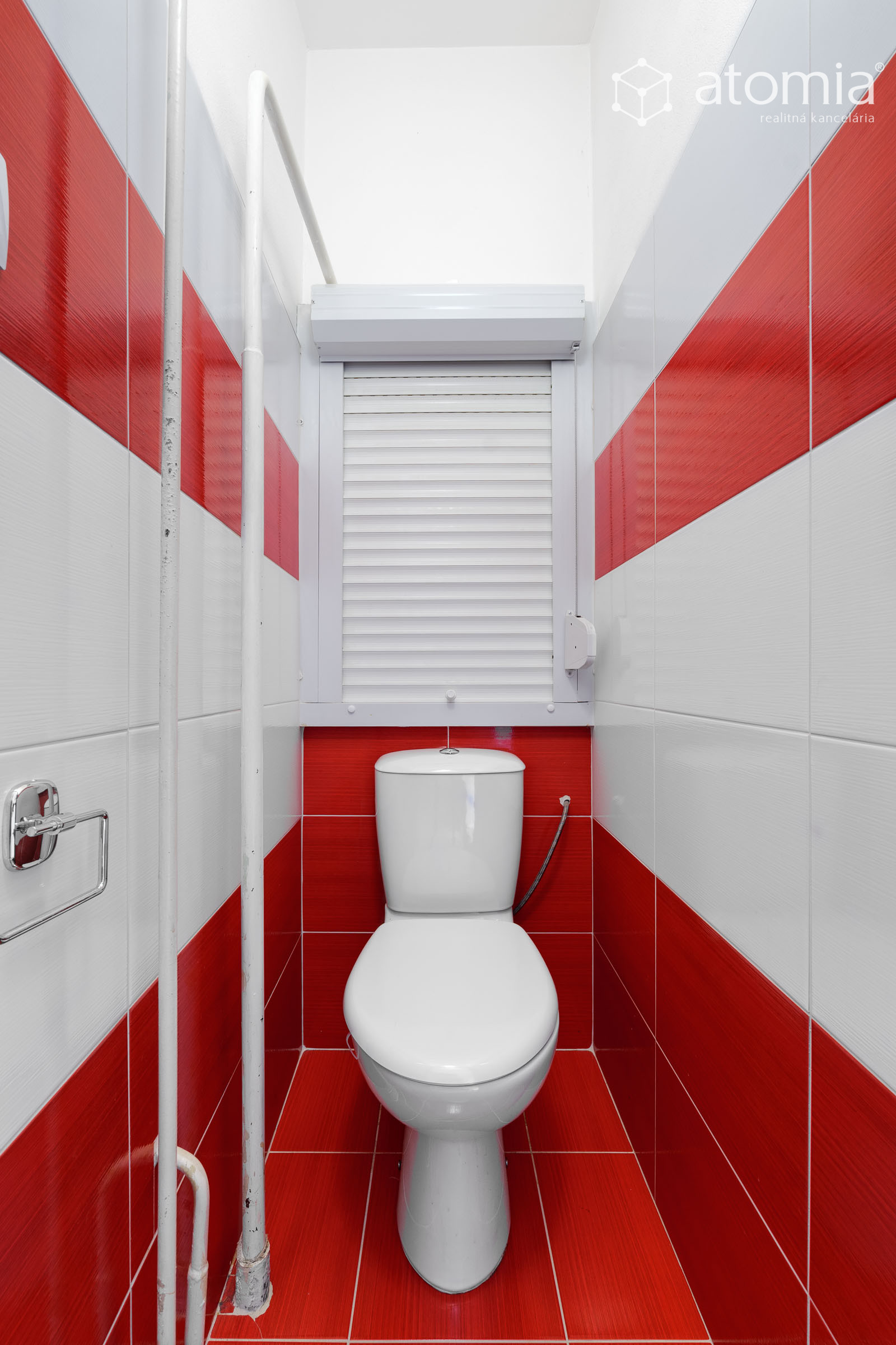 Kúpeľňa je murovaná, je po kompletnej rekonštrukcii. V kúpeľni je osadená vaňa so zástenou, ktorá umožňuje využitie vane aj na komfortné sprchovanie sa, páková batéria. V kúpeľni sa nachádza umývadlo osadené v skrine, zrkadlo, páková batéria, rebríkový radiátor. Na podlahe je dlažba a keramický obklad stien až po strop. Pračka je osadená v priestrannej predsieni (prívod vody a aj odpad). Toaleta je samostatná. Nová sanita v toalete, nové obklady a dlažba. Komoru v byte a v blízkosti kuchyne si budú pochvaľovať všetci bývajúci v tomto byte - zväčšuje úložný priestor, prípadne môže byť v budúcnosti aj miestnosťou na umiestnenie pračky a sušičky. Nová dlažba v komore a úložný regál na mieru.