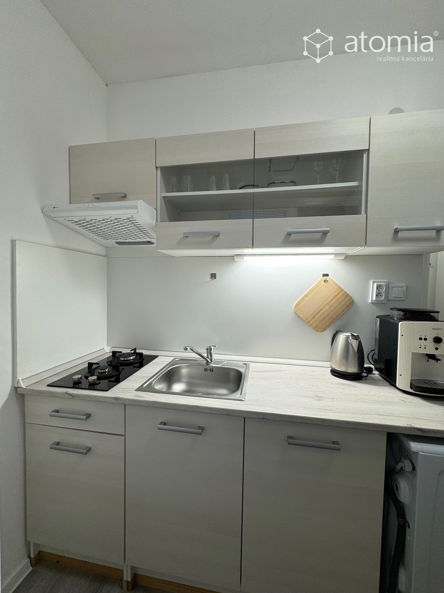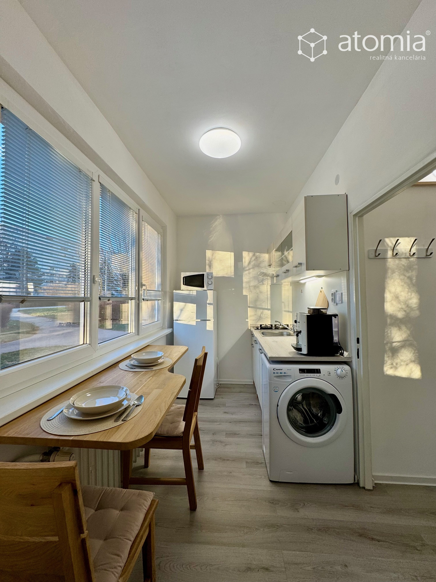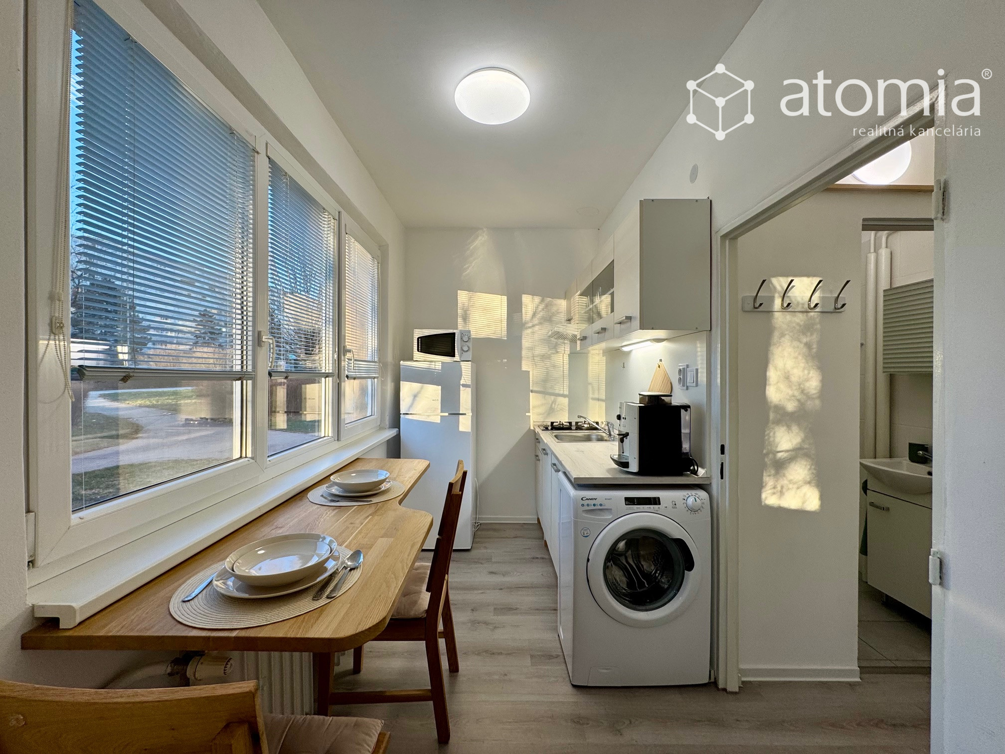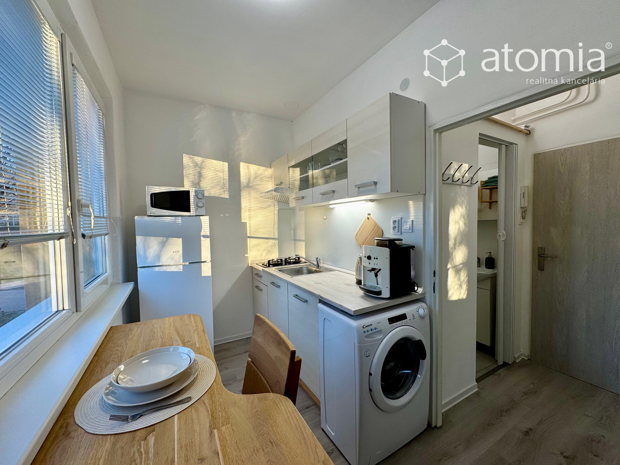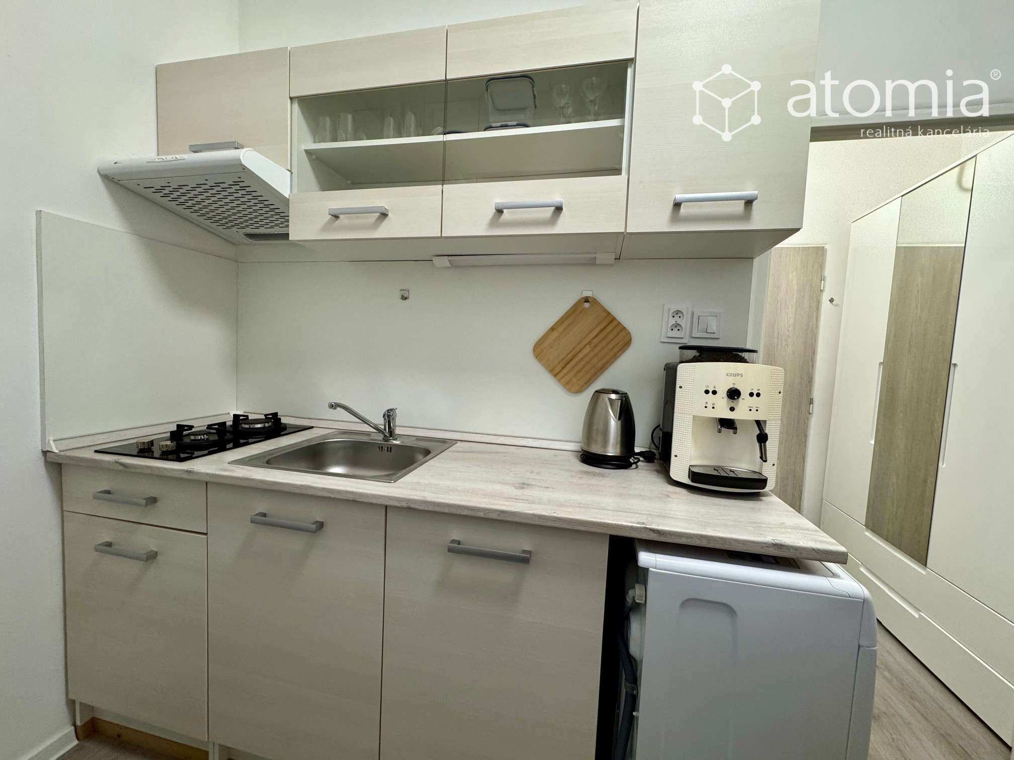 Kuchyňa - kuchynská linka na báze dreva, drevený na mieru vyrobený pracovný stôl, stoličky, indukčná varná doska, chladnička s mrazničkou, pračka, mikrovlnka, kávovar, rýchlovarná konvica, sendvičovač a kompletné vybavenie kuchynkými potrebami.