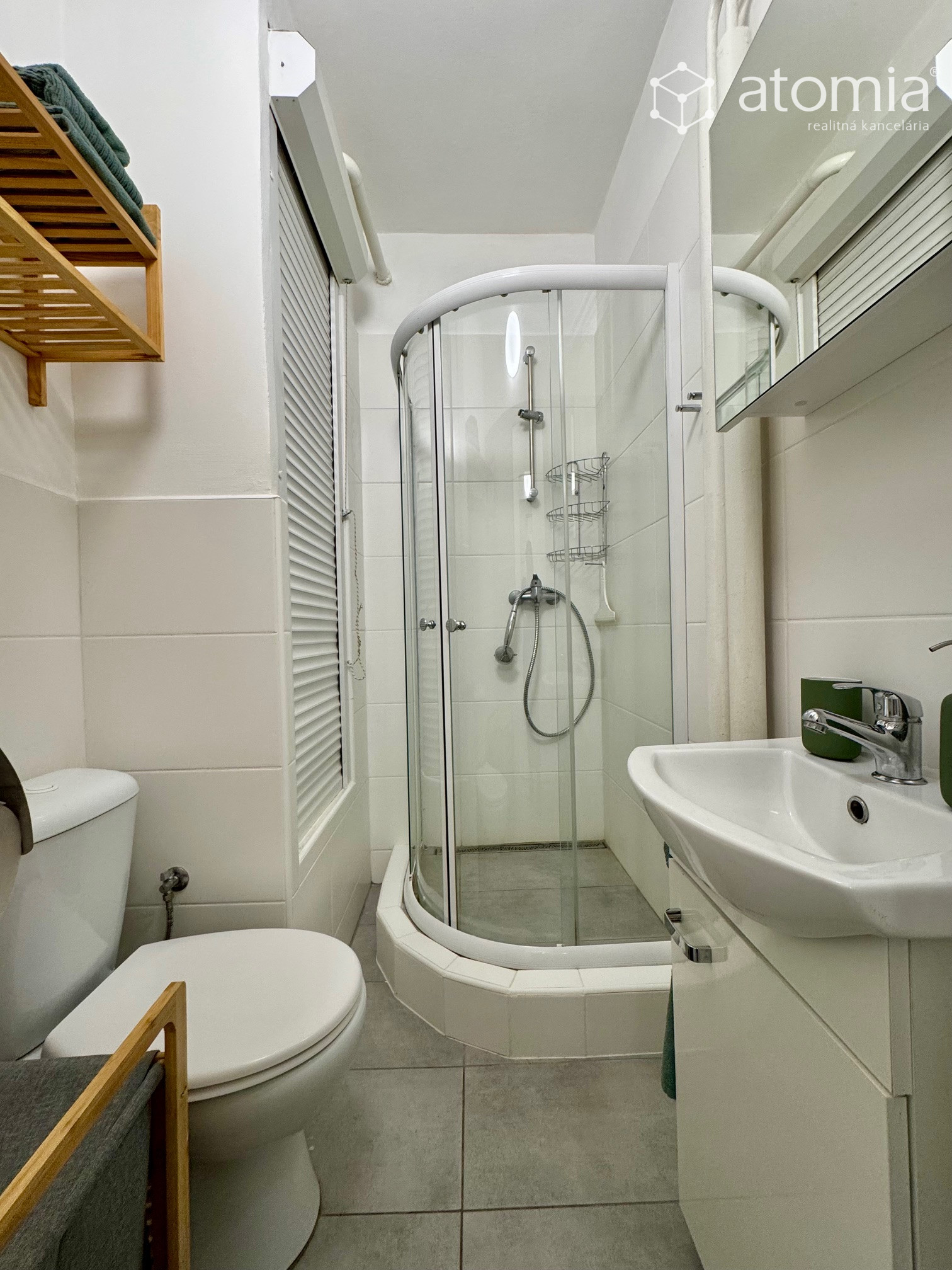 Kúpeľňa - sprchový kút, toaleta, umývadlo v skrinke so zrkadlom.