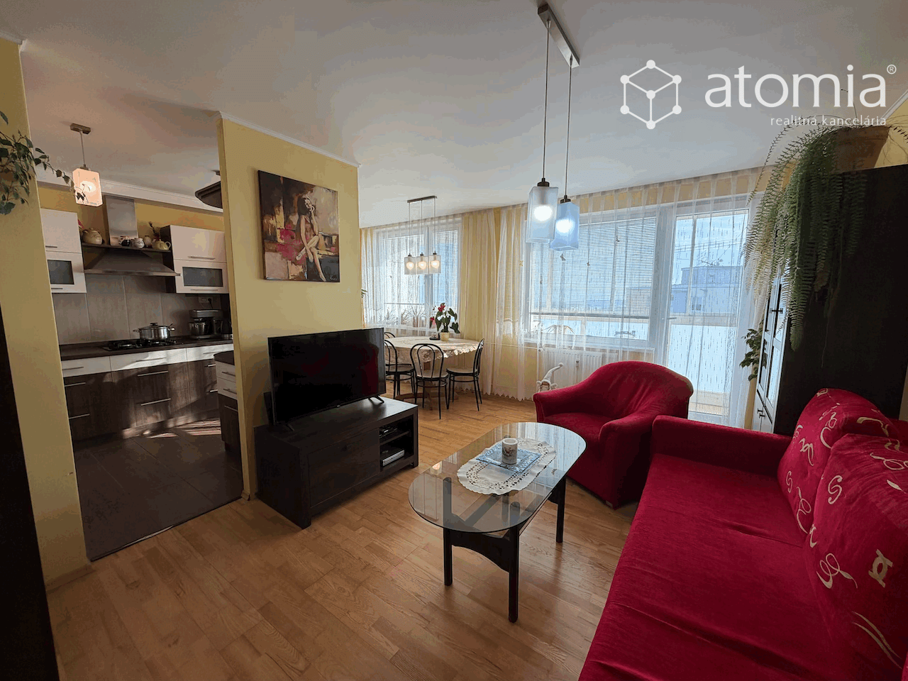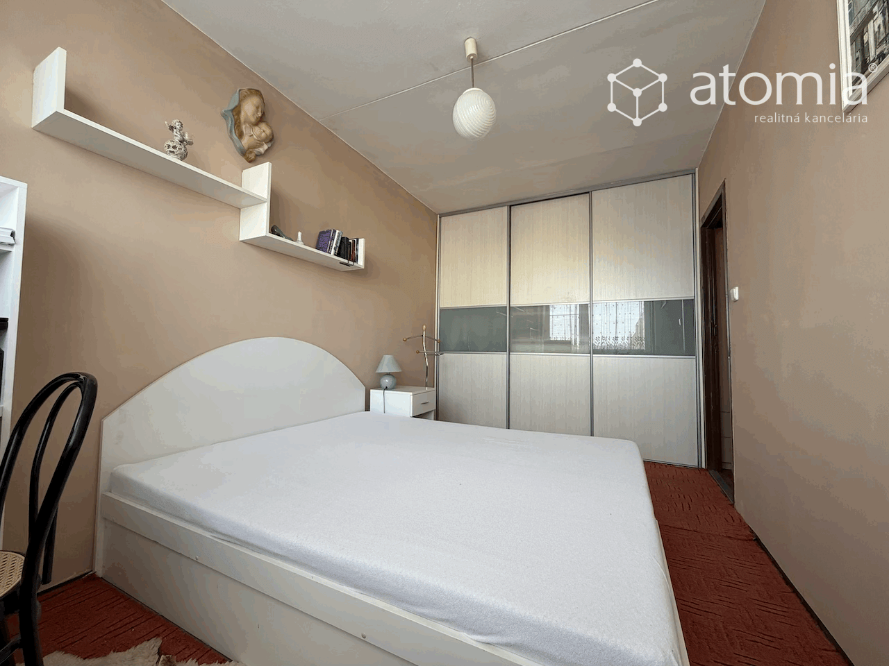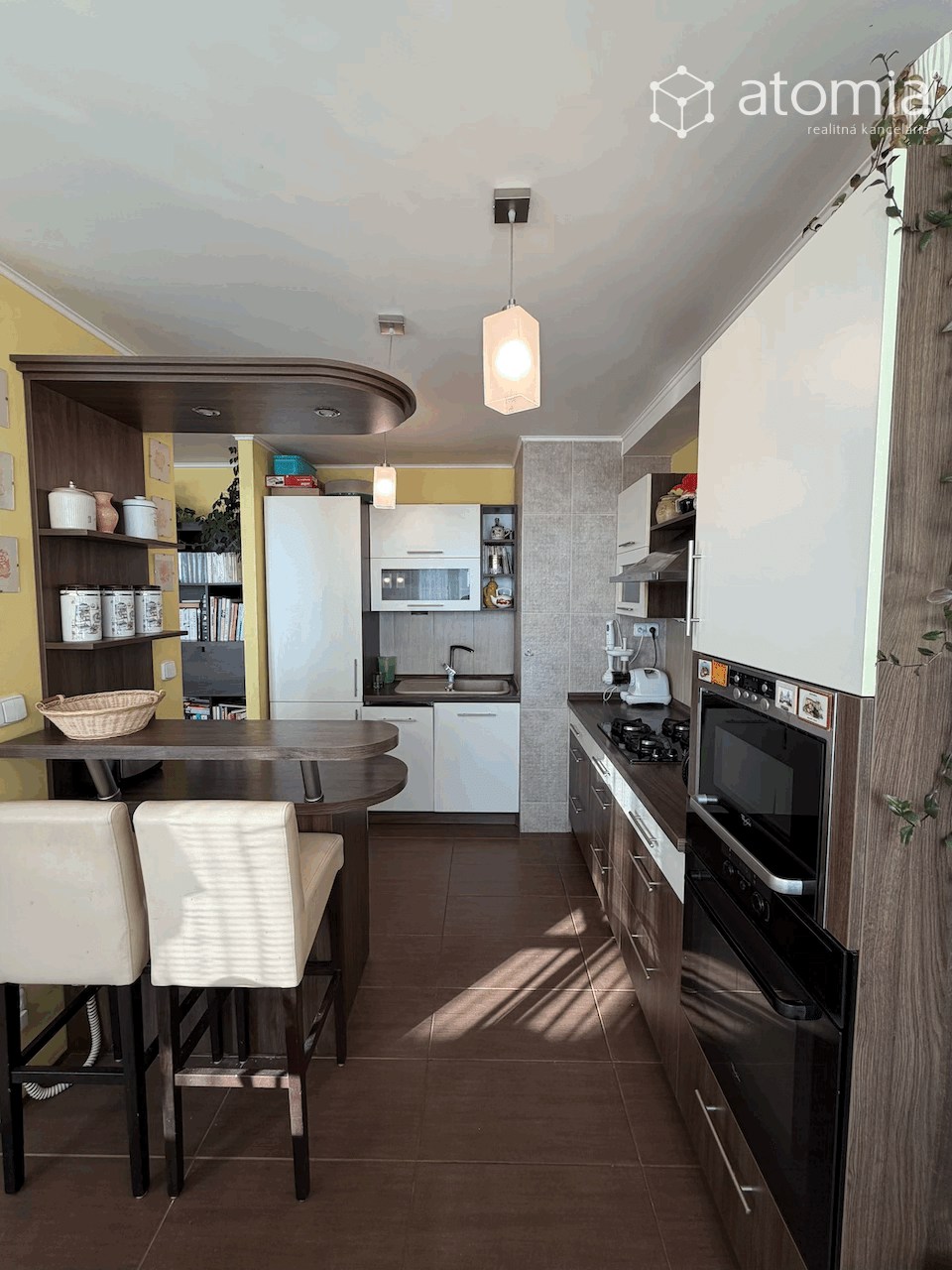 Byt o výmere 68m2 sa nachádza na výbornom 7. poschodí bytového domu a prešiel čiastočnou rekonštrukciou, ktorú zahŕňa: nové rozvody vody, odpadu a elektriny (okrem 2 izieb), plastové okná, vnútorné dvere, podlahy a dlažby, sanita, radiátory, murované jadro so zmenenou dispozíciou, kuchynská linka so vstavanými spotrebičmi (rúra, varná doska, mikrovlnná rúra, umývačka riadu, chladnička s mrazničkou) a vstavaná skriňa v spálni.