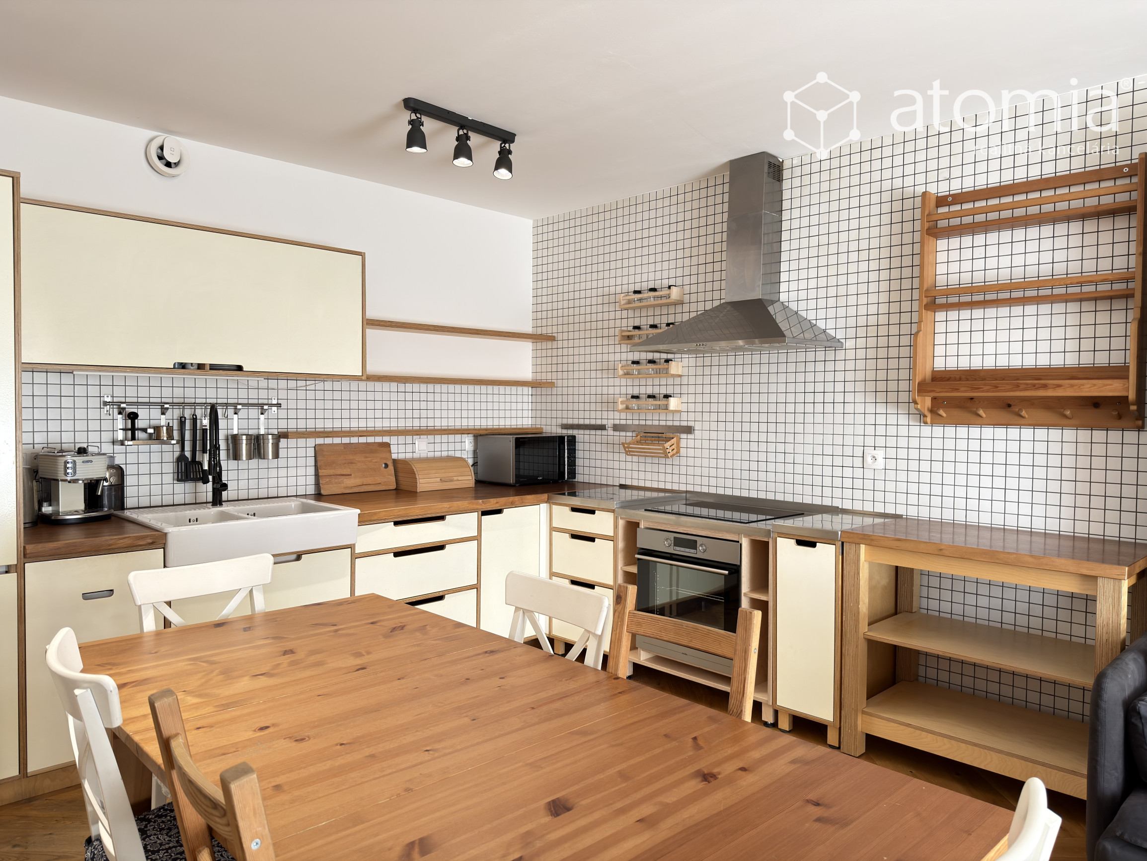 The apartment is fully furnished with high-quality furniture and appliances. The modern kitchen is equipped with an oven, induction cooktop, microwave, coffee machine, and plenty of storage space.