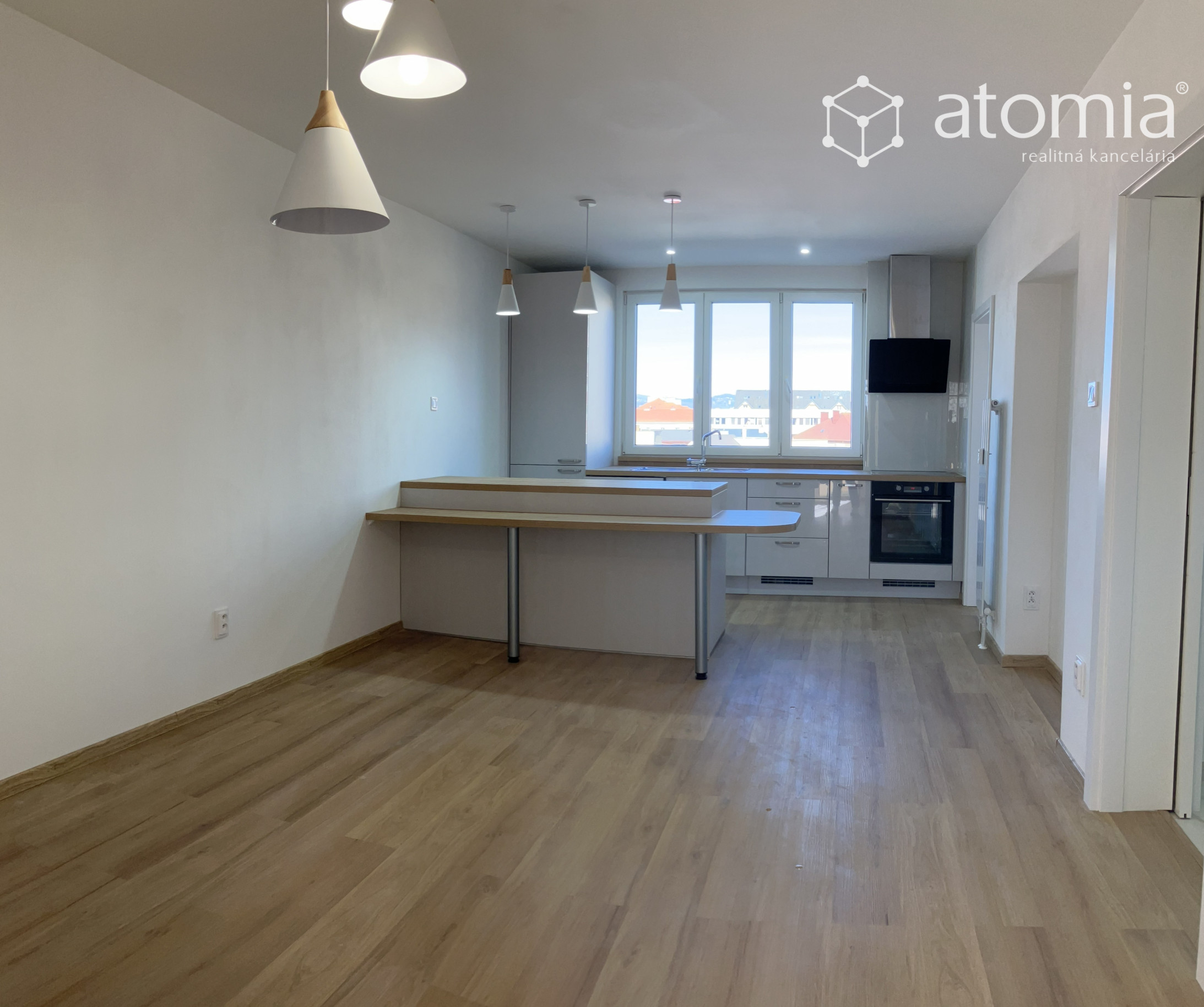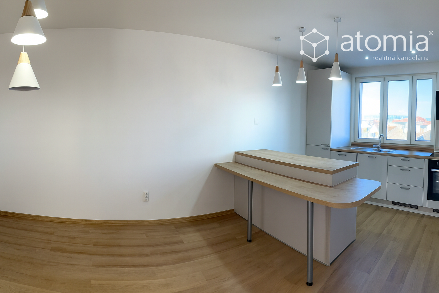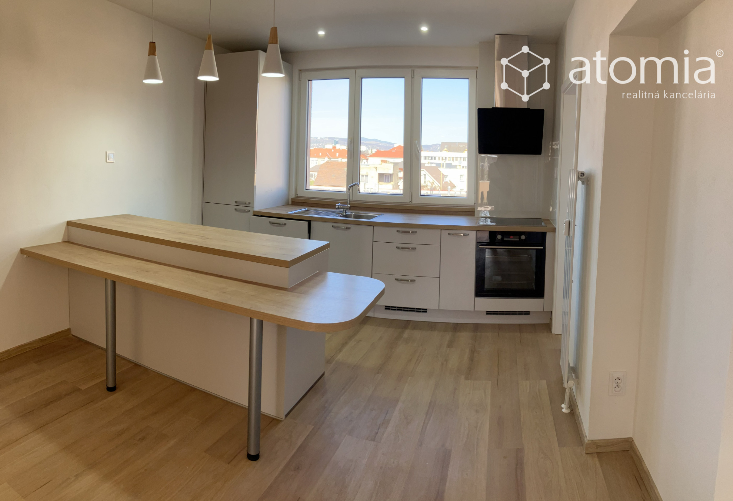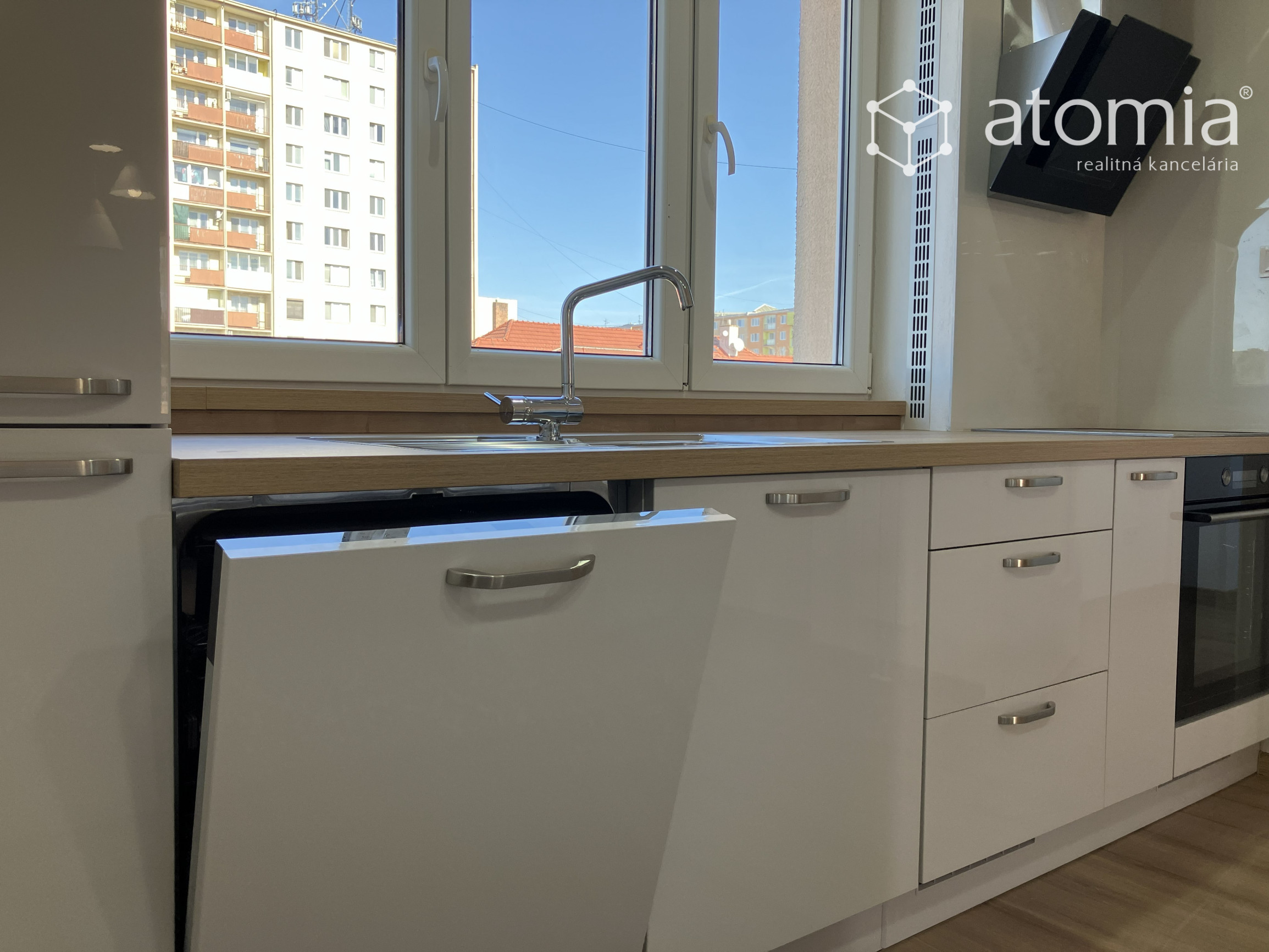 Byt o veľkosti 54m2 sa nachádza na 2.np panelového bytového domu bez výťahu, je po úplnej modernej prerábke v neutrálnych farbách, ponúka sa na prenájom nezariadený, disponuje vstavanými spotrebičmi v kuchyni (chladnička, mraznička, umývačka riadu, sklo-keramická varná doska, el. rúra), obývacia izba je od kuchyne funkčne oddelená raňajkovým pultom. Byt ďalej disponuje dvomi nepriechodnými izbami, loggiou (cca 3m2), na chodbe je priestranná vstavaná skriňa a priestor v kúpeľni je plne využitý na veľký sprchový kút, umývadlo s úložnými zásuvkami, práčku aj toaletu. K bytu prislúcha aj pivnica v suteréne bytového domu.