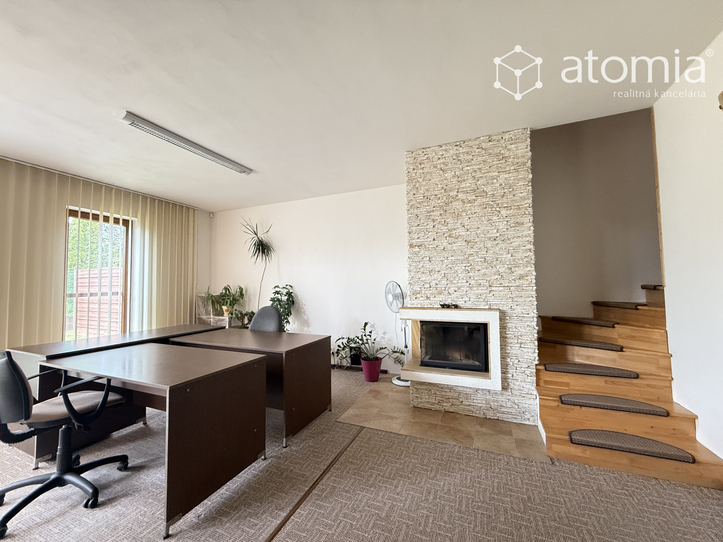 - Prízemie: priestranná obývacia izba s krbom, moderná kuchyňa, komora, samostatná toaleta