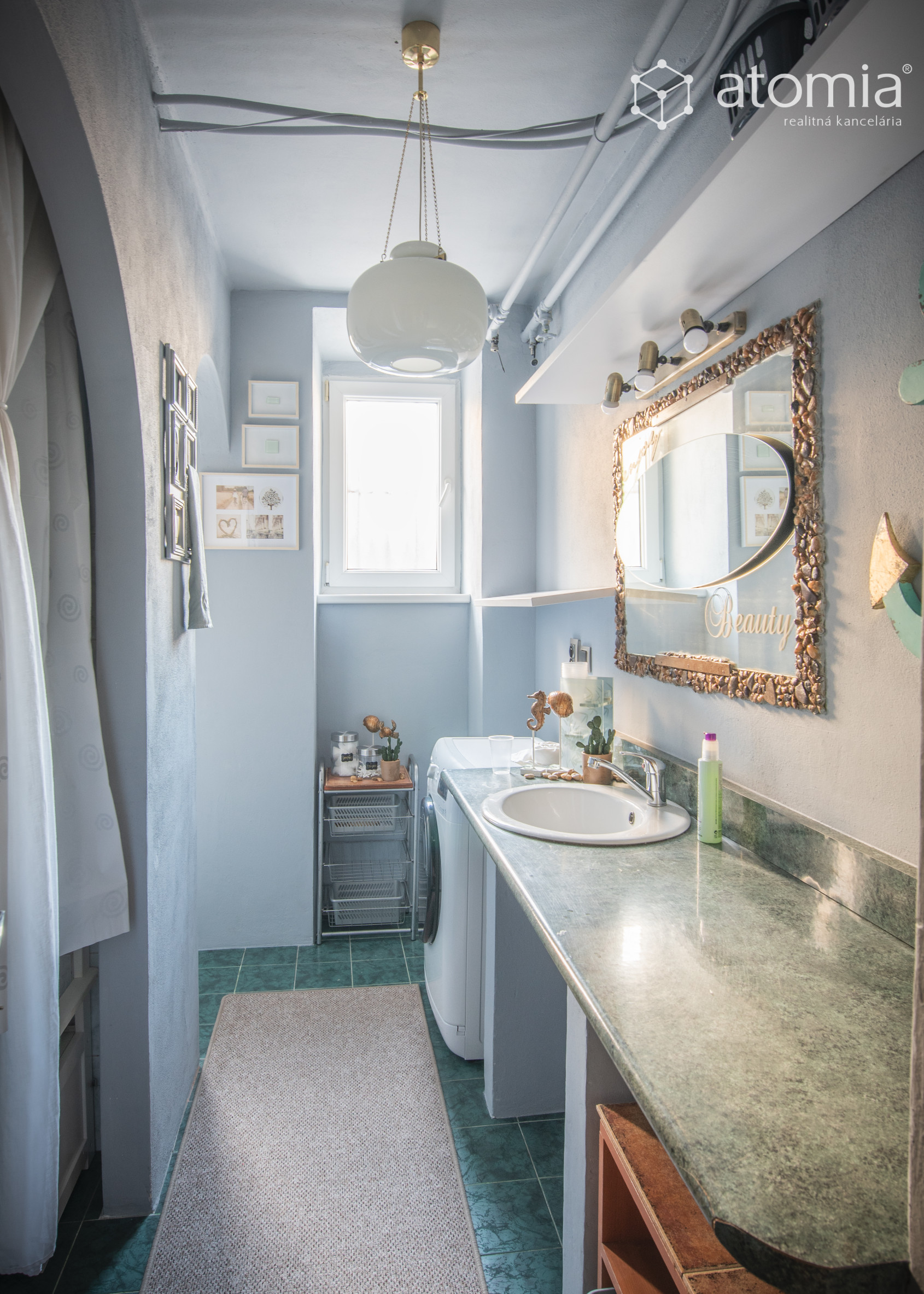 Kúpeľňa je zväčšená o časť pôvodnej chodby a je presvetlená a vetrateľná oknom. V kúpeľni sa nachádza toaleta s okno, rohová vaňa, umývadlo, kotol Vajllant, pračka so sušičkou.