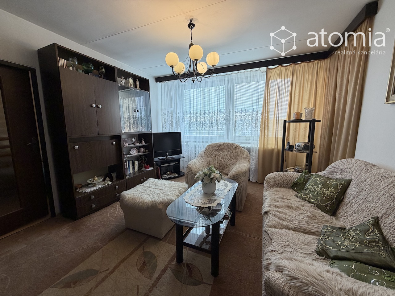 Dispozícia bytu pozostáva z dvoch nepriechodných izieb, obývačky, kuchyne, kúpeľne s vaňou a samostatného WC. Z jednej izby je výstup na priestrannú loggiu. K bytu prislúcha kumbál na chodbe a pivnica.